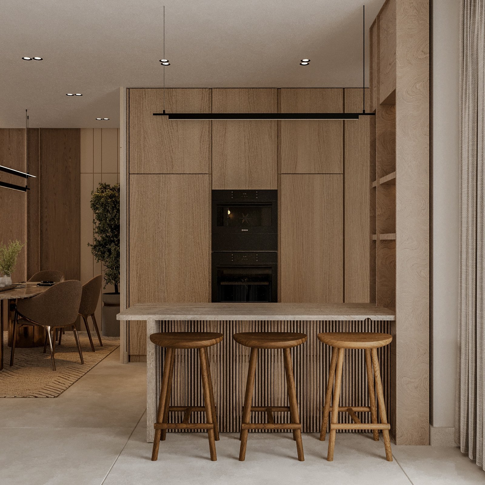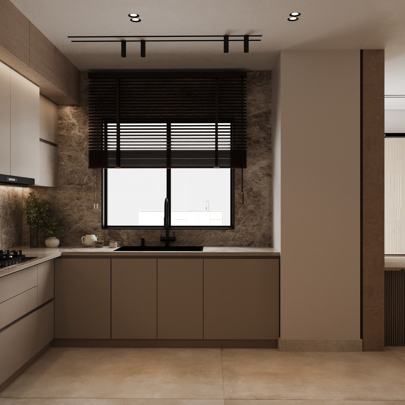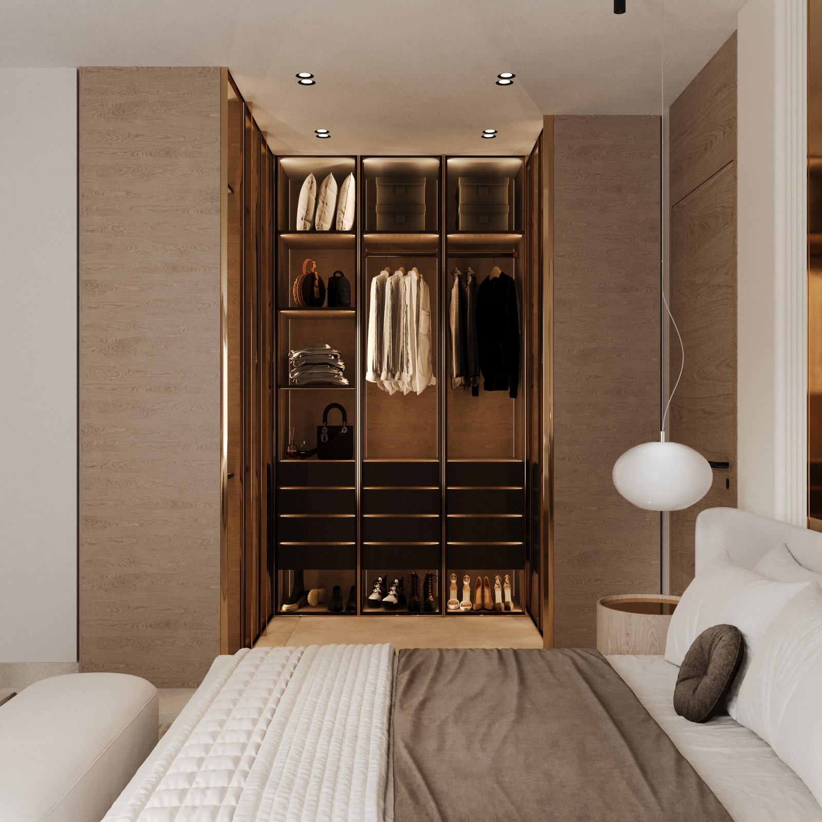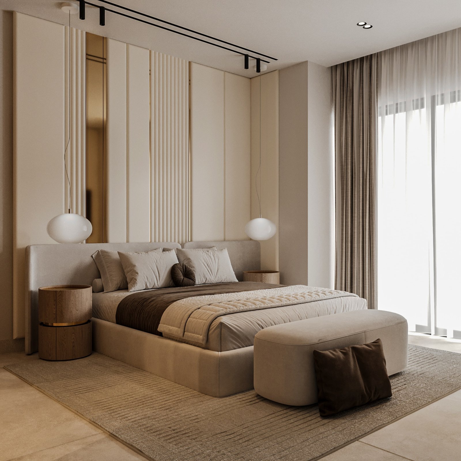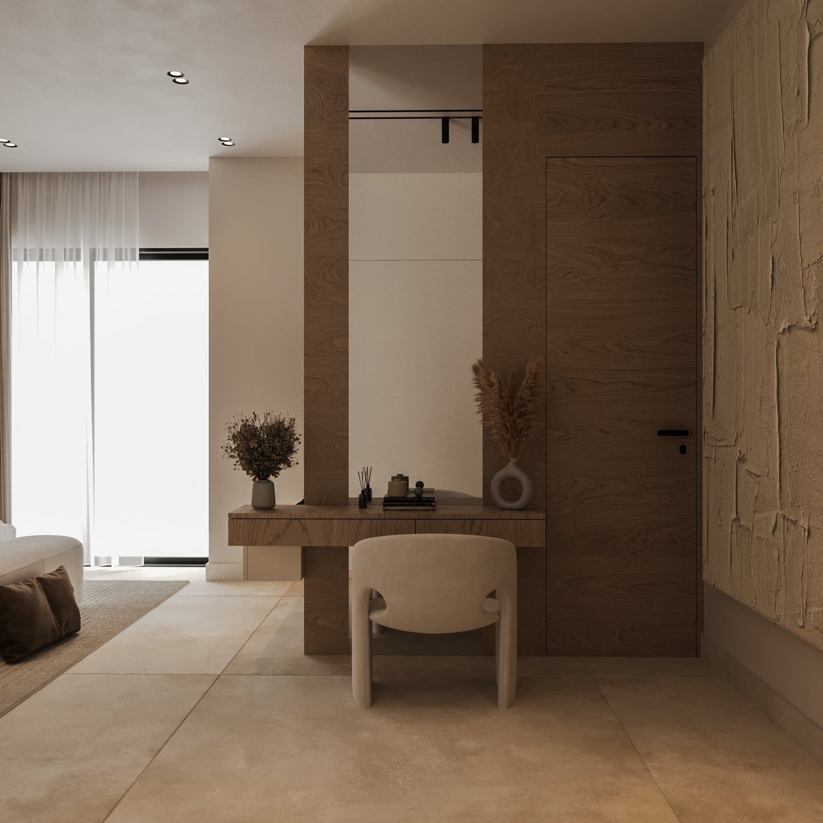 تم تصميم الفراغات بأسلوب يحقق الانسيابية والمرونة في الاستخدام، مع تحقيق توازن واضح بين الجماليات والوظيفة العملية. وقد تم الاهتمام بشكل خاص بالحلول التخزينية، سواء في المطبخ أو غرف النوم أو غرف الملابس، لضمان الاستفادة القصوى من المساحات دون التأثير على الهوية البصرية العامة للمشروع. أما الأثاث فقد تم اختياره بخطوط ناعمة وانسيابية تضيف إحساساً بالراحة والدفء، مع الحفاظ على الطابع العصري للتصميم.