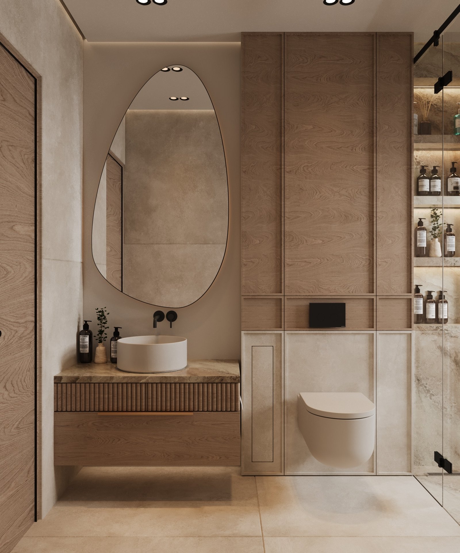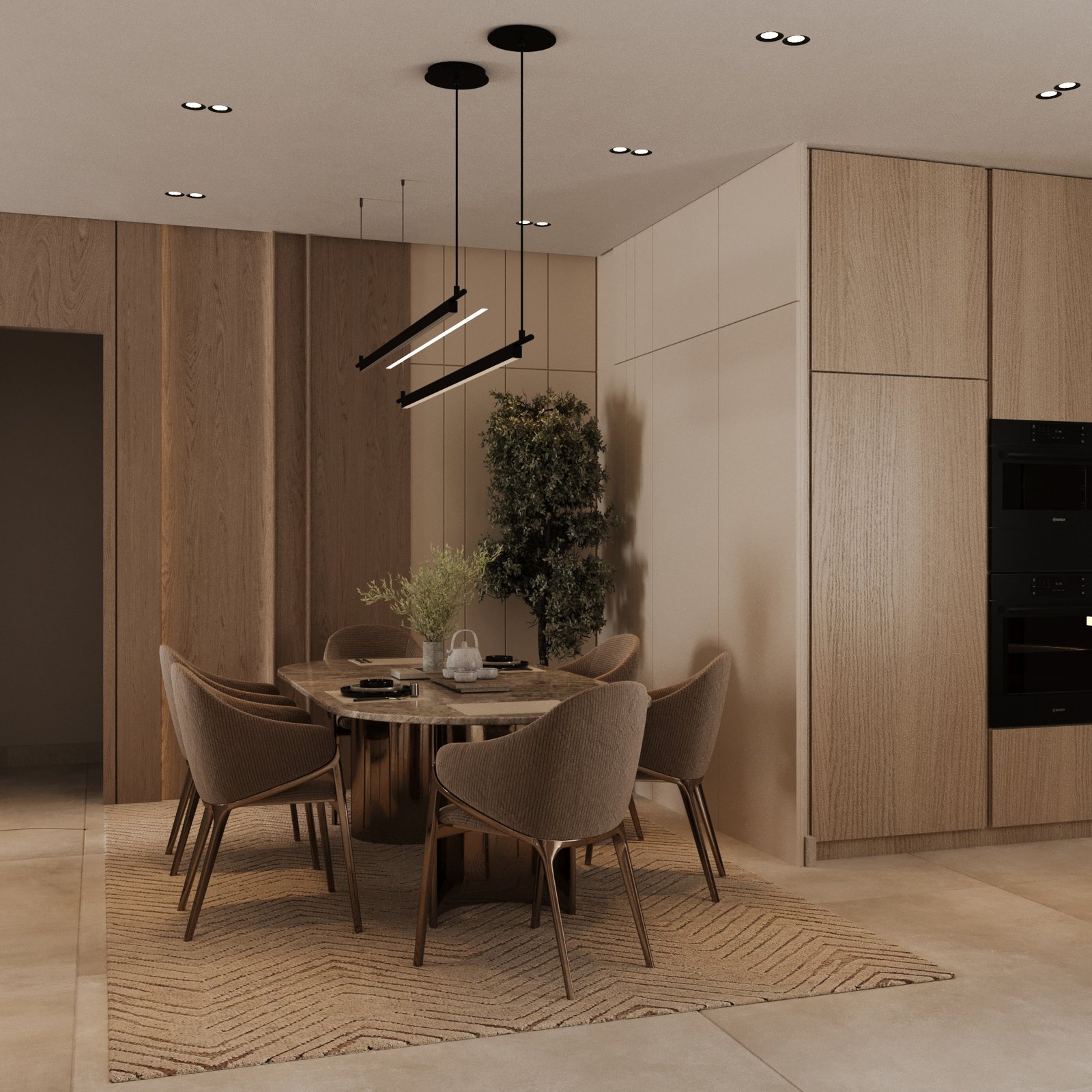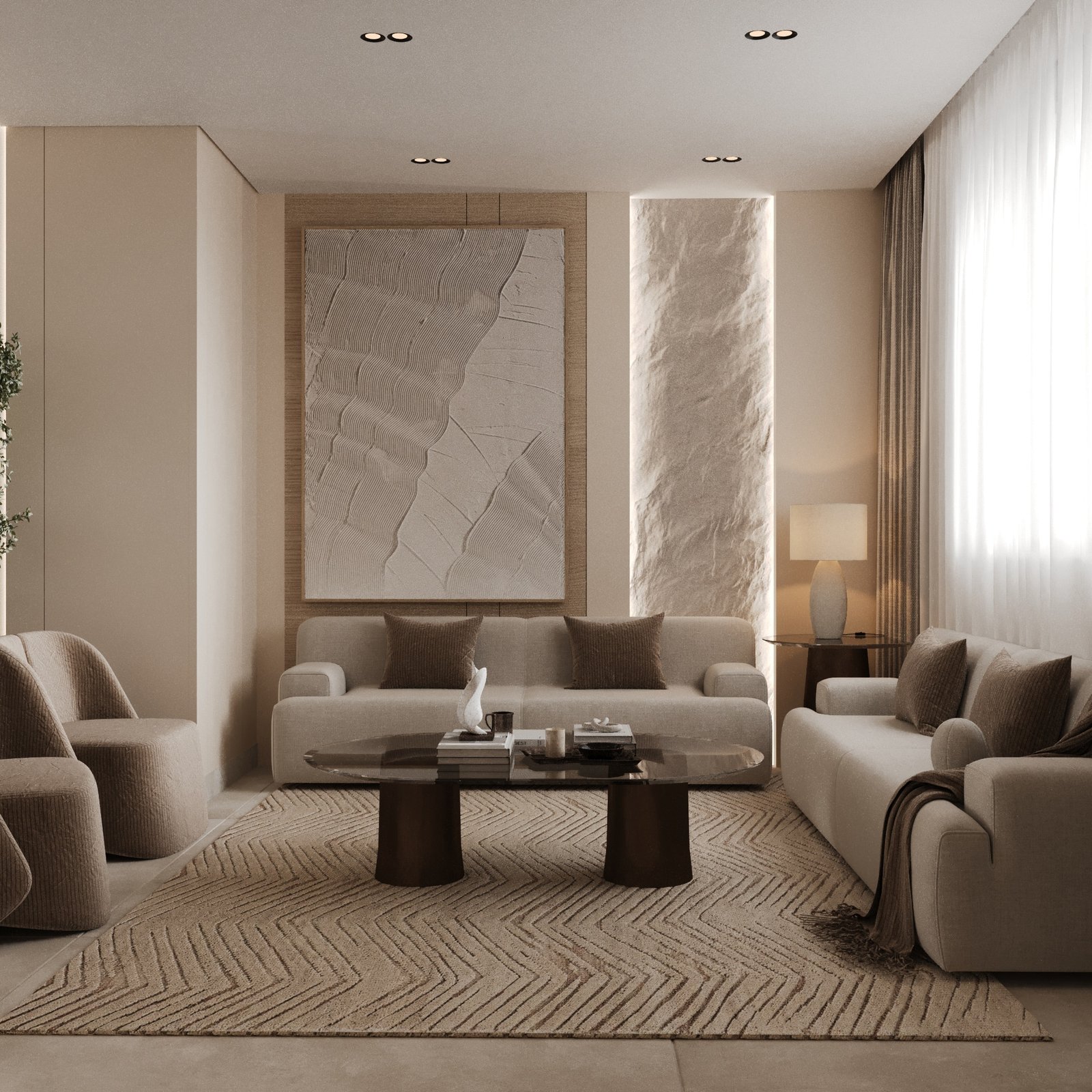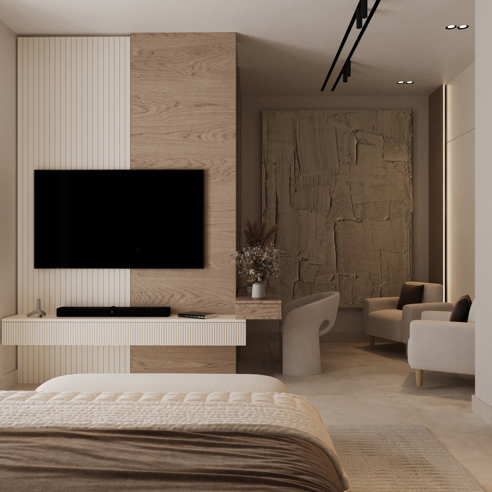 تلعب التفاصيل المعمارية مثل البانوهات، والشرائح الخشبية، والجدران المضيئة دوراً محورياً في تكوين هوية بصرية مميزة للمكان. ويُعد هذا المشروع مناسباً للأشخاص الذين يفضلون الهدوء والتنظيم والفخامة العملية التي تحافظ على أناقتها مع مرور الزمن دون أن تفقد حداثتها. وبشكل عام، يعبر المشروع عن مستوى متقدم من الاحترافية في الدمج بين التصميم المعاصر والطابع السكني المريح.