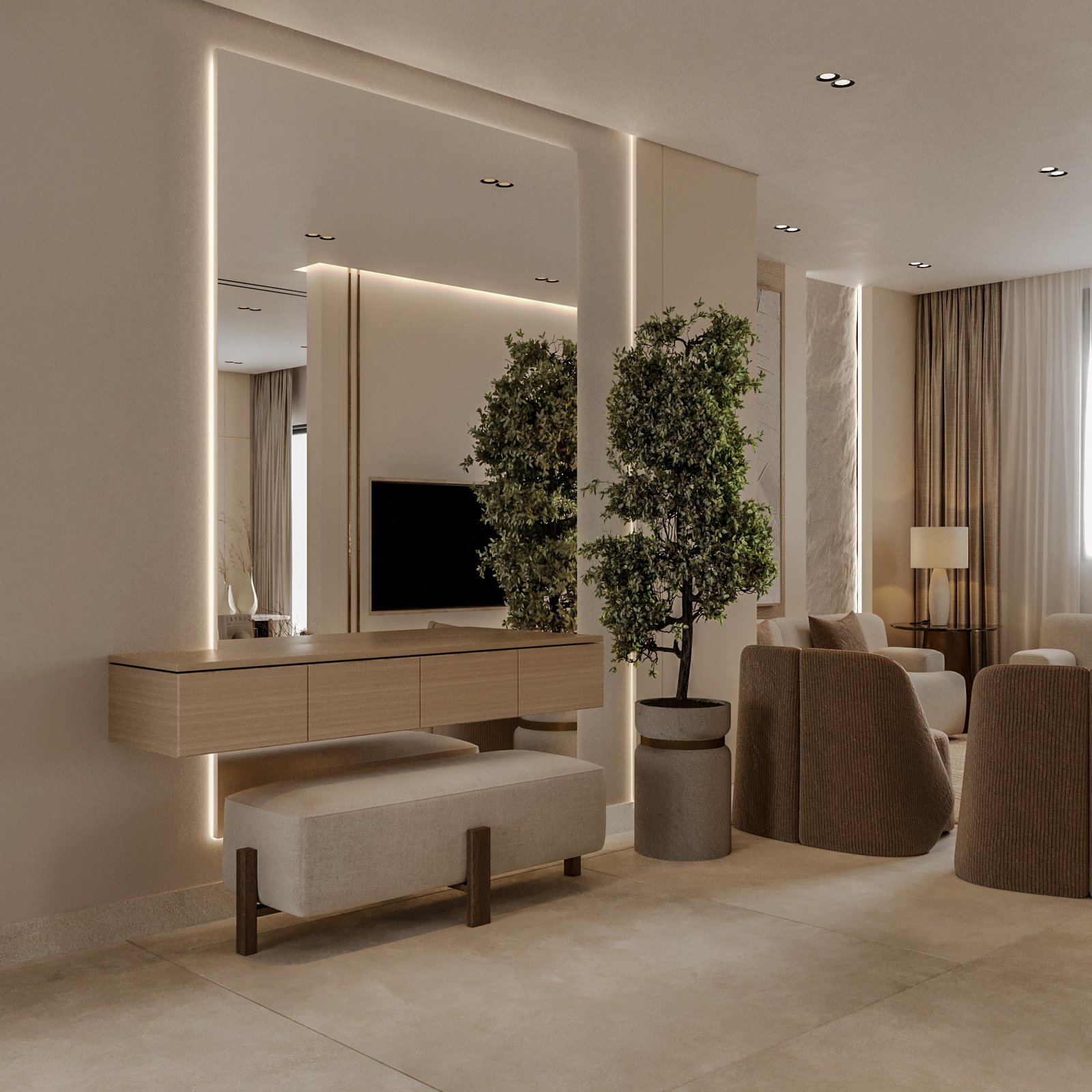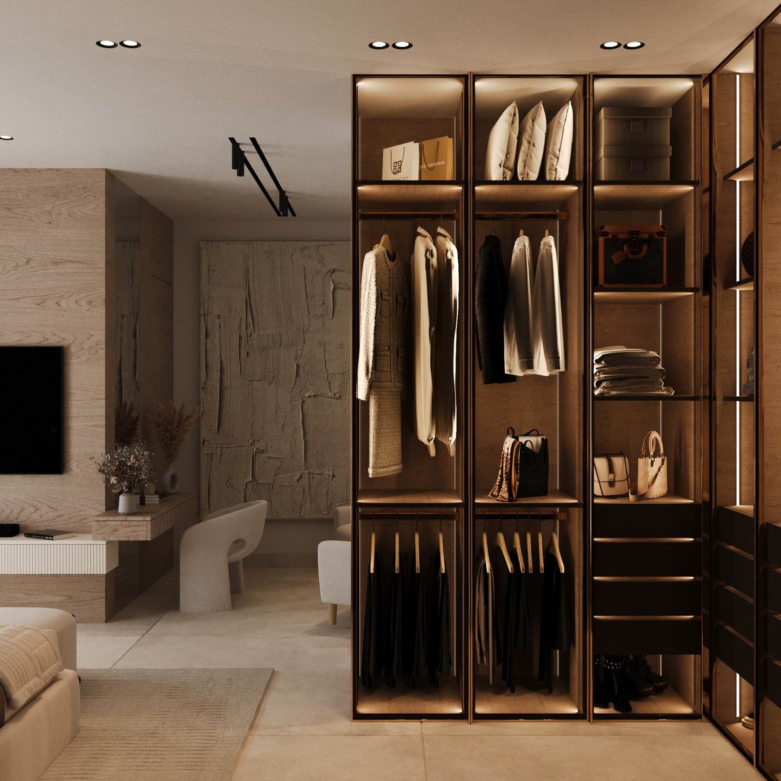 يعكس المشروع العاشر مفهوم الفخامة الهادئة القائمة على إبراز جودة الخامات ودقة التفاصيل بدلاً من الاعتماد على الزخارف المبالغ فيها. يعتمد التصميم على تدرجات الألوان الدافئة مثل البيج، والأوف وايت، والبني الطبيعي للأخشاب، مما يخلق بيئة مريحة بصرياً ونفسياً داخل الفراغ. كما تم توزيع الإضاءة بعناية، سواء من خلال الإضاءة المخفية داخل الجدران أو داخل وحدات التخزين، وهو ما يمنح عمقاً بصرياً ويبرز جمال الخامات وملمسها الطبيعي.