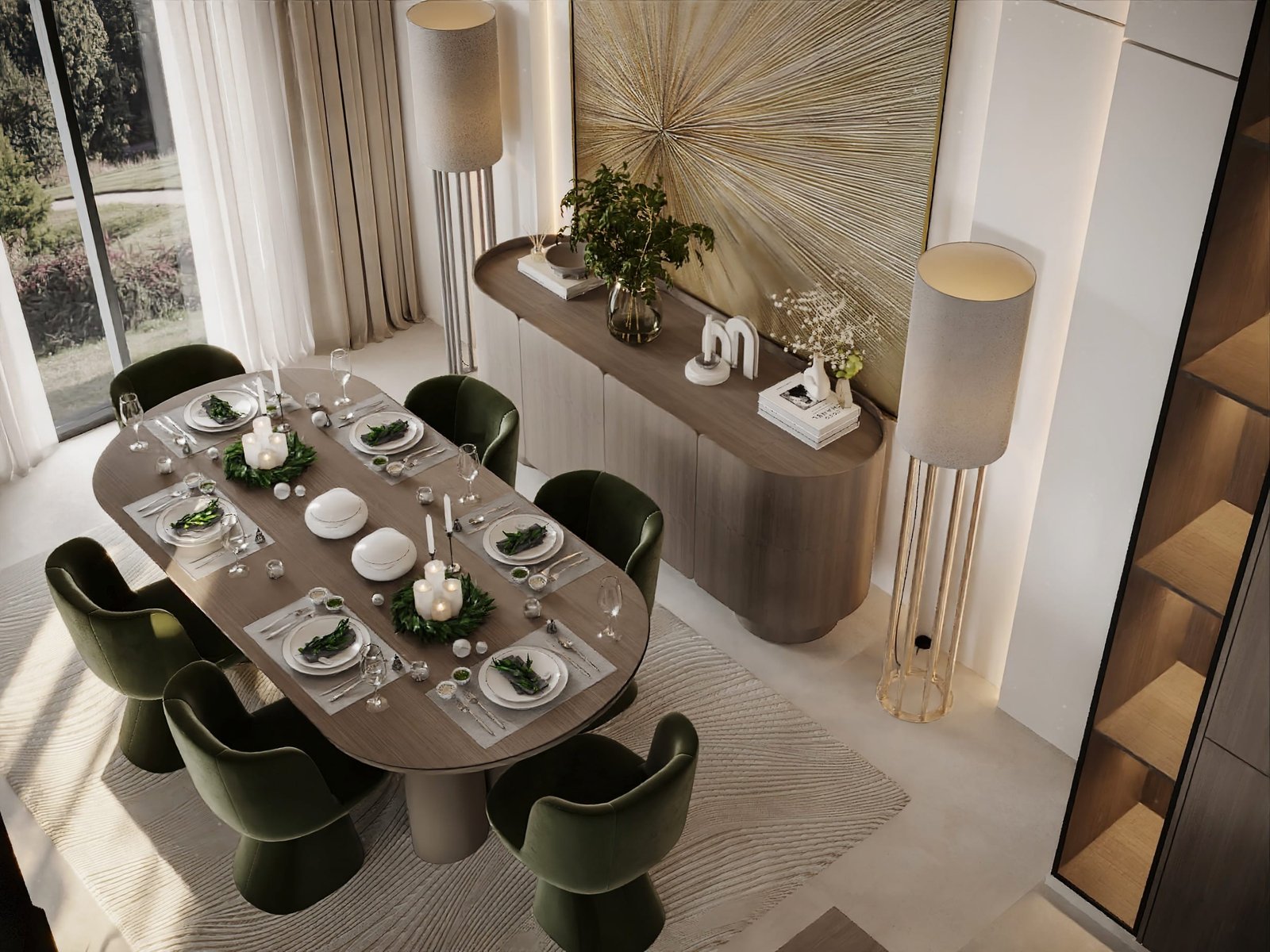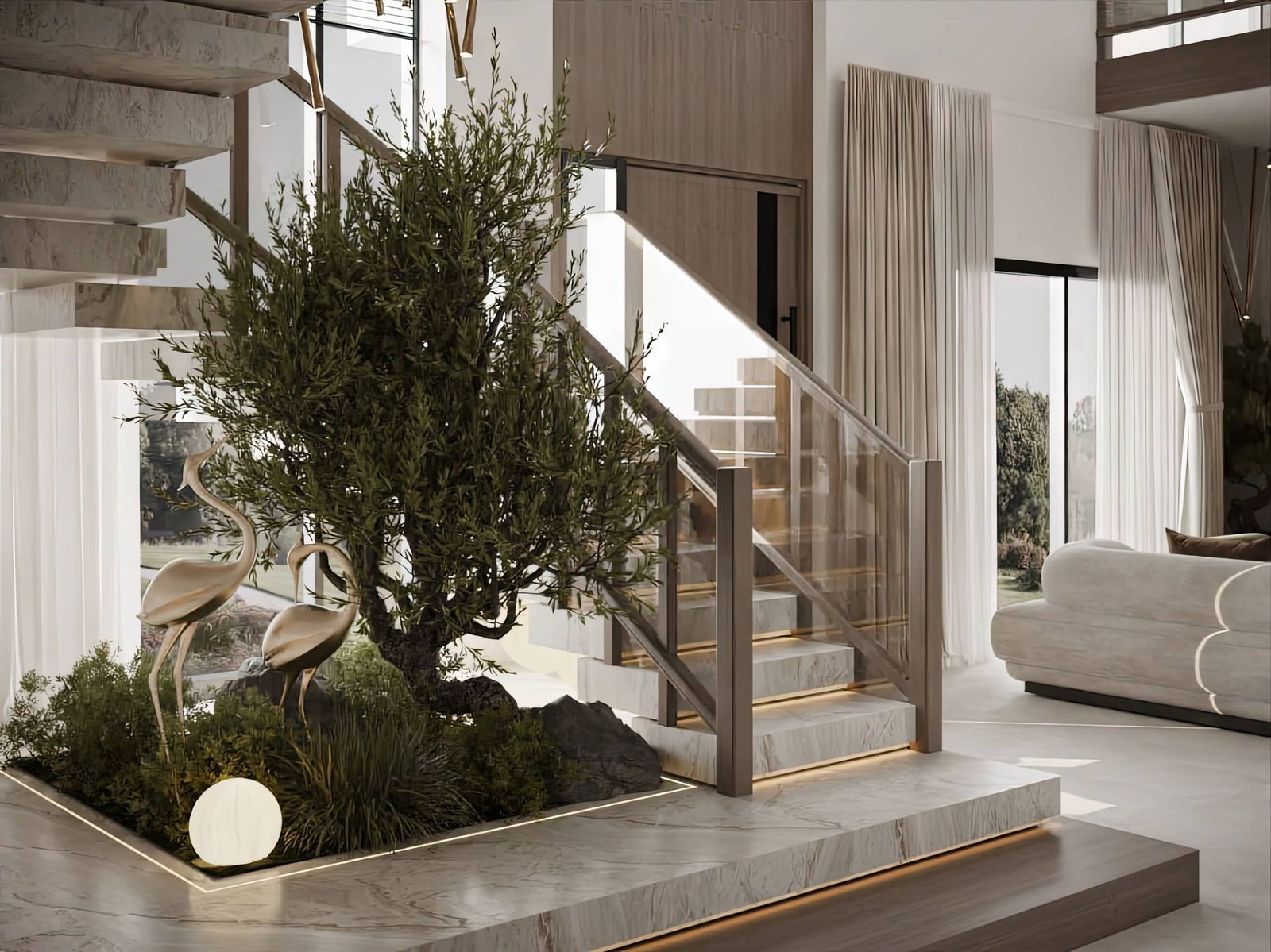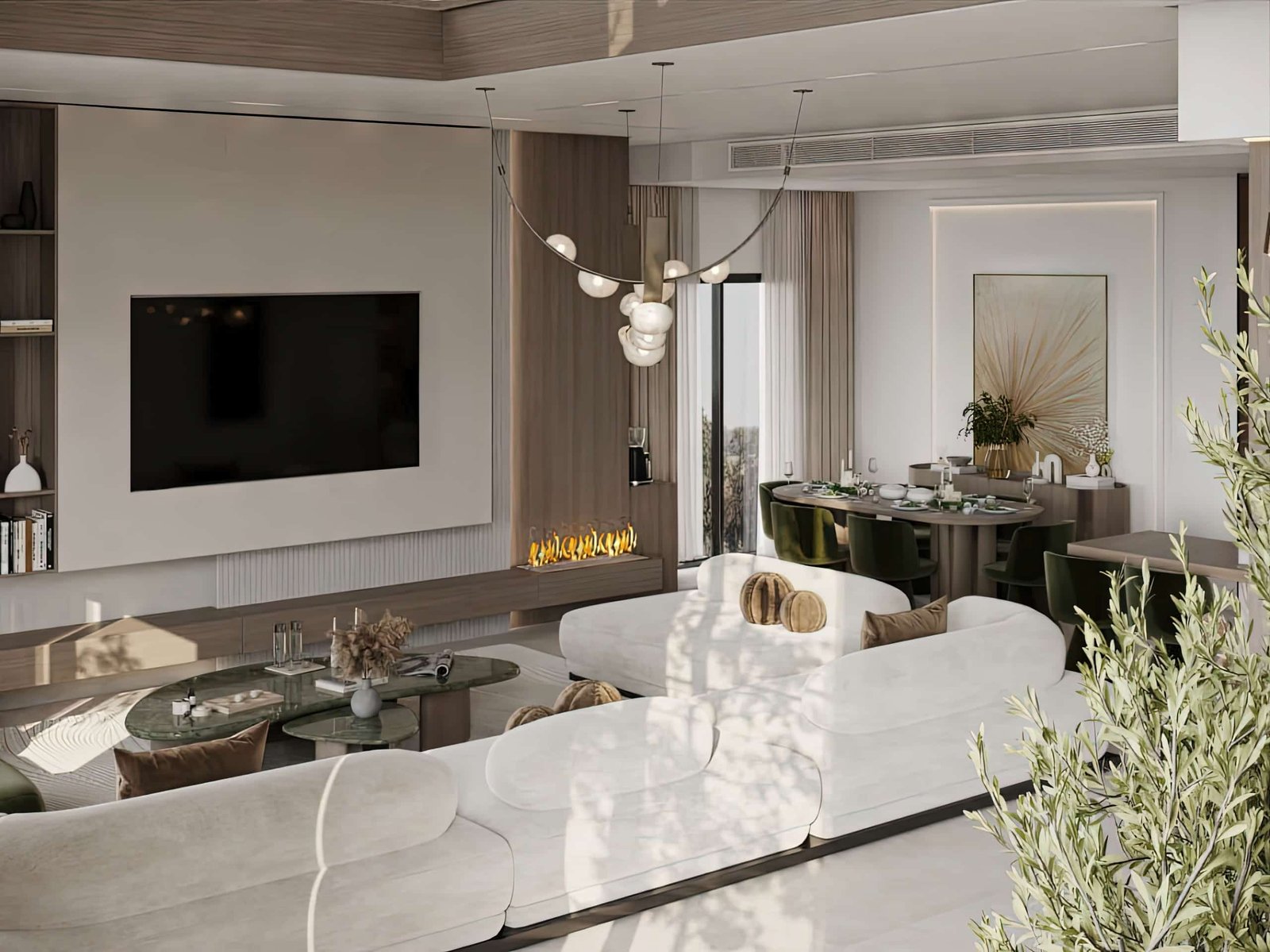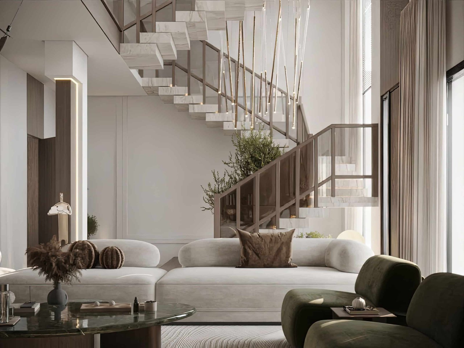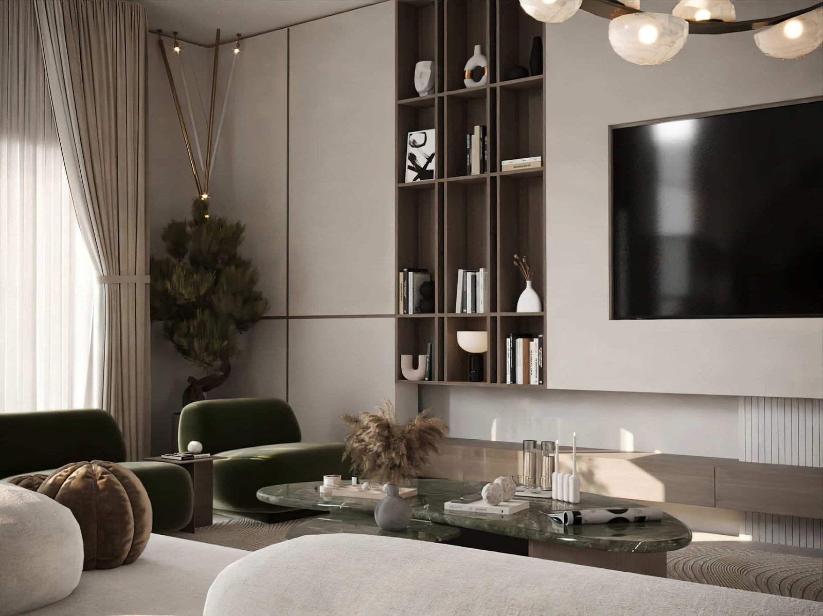 تم اختيار الأثاث بعناية بحيث يكون مريح بصريًا ووظيفيًا في نفس الوقت، مع اعتماد أشكال ناعمة ومنحنيات خفيفة بتكسر حدة الخطوط المستقيمة في المعمار. التفاصيل الديكورية جاية بشكل هادي ومدروس عشان تضيف فخامة بدون زحمة بصرية، وده بيخلي المشروع مناسب لأسلوب حياة راقي بيعتمد على الهدوء والبساطة الذكية مع الحفاظ على مستوى عالي من الجودة والتشطيب.