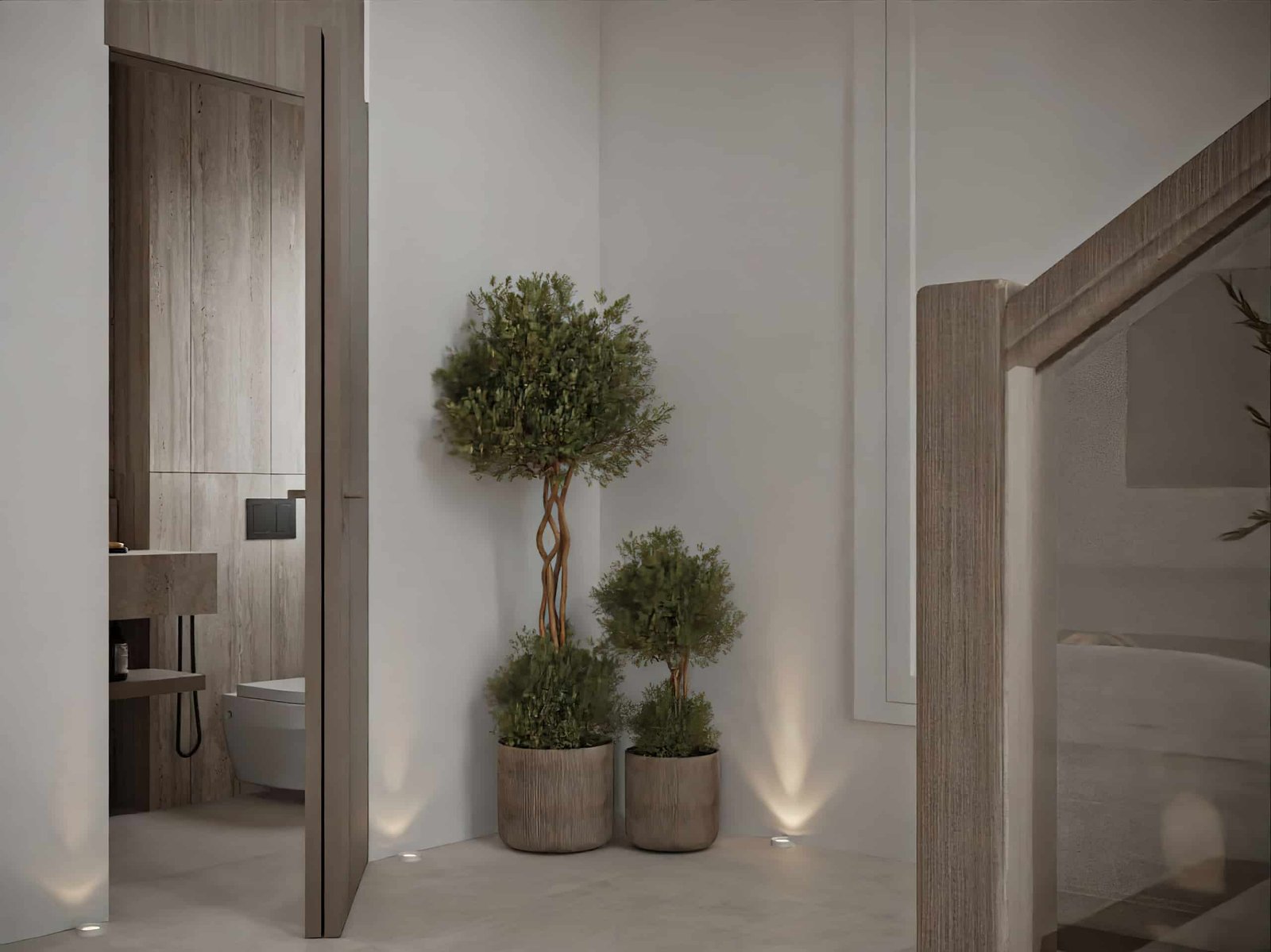 الفراغات متصممة بطريقة بتخلي الحركة داخل البيت طبيعية وسلسة، مع ترابط واضح بين مناطق المعيشة والسفرة والمداخل، وده بيدي إحساس باتساع المكان حتى مع وجود تفاصيل تصميمية غنية. الإضاءة عنصر أساسي في المشروع، سواء الإضاءة الطبيعية اللي بتدخل من الفتحات الكبيرة أو الإضاءة الصناعية المخفية اللي بتبرز جمال الخامات وبتخلق جو دافئ في المساء.