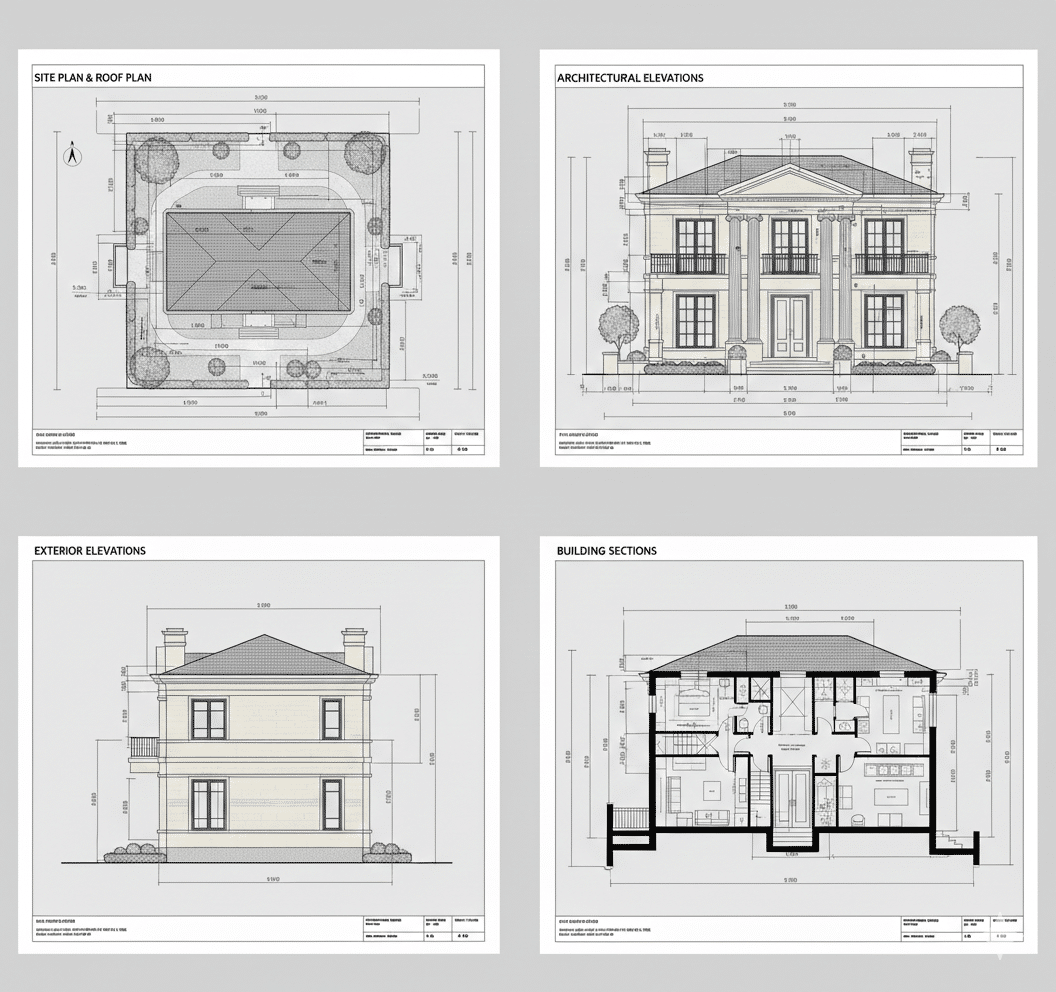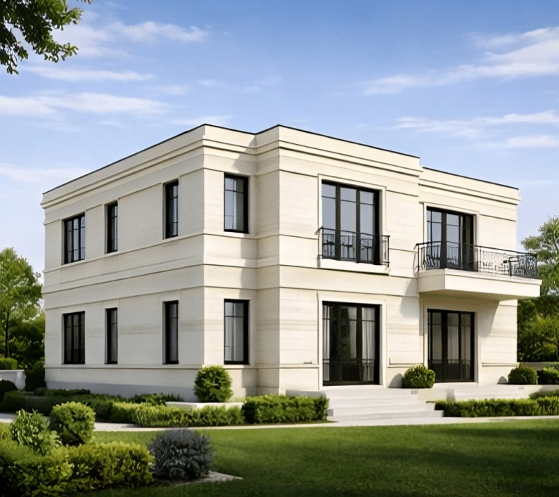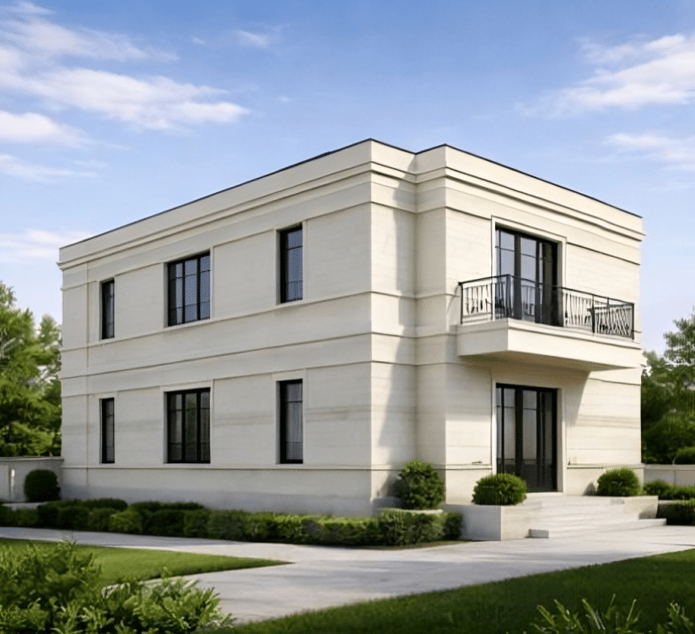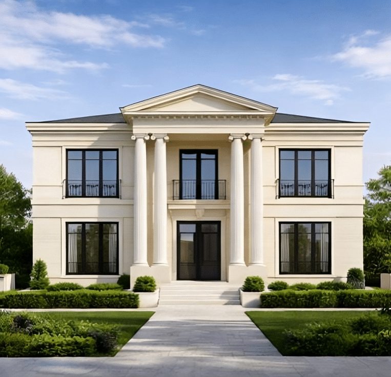 تعتمد الواجهة الرئيسية على أعمدة كلاسيكية كاملة الارتفاع مع تاج معماري مميز، مما يعزز الطابع الملكي للمبنى ويخلق مدخلاً مهيباً يعكس الفخامة المعمارية. كما تم استخدام الحجر الطبيعي بدرجات كريمية هادئة مع تفاصيل كرانيش دقيقة وإطارات فتحات سوداء لخلق تباين أنيق ومتوازن.