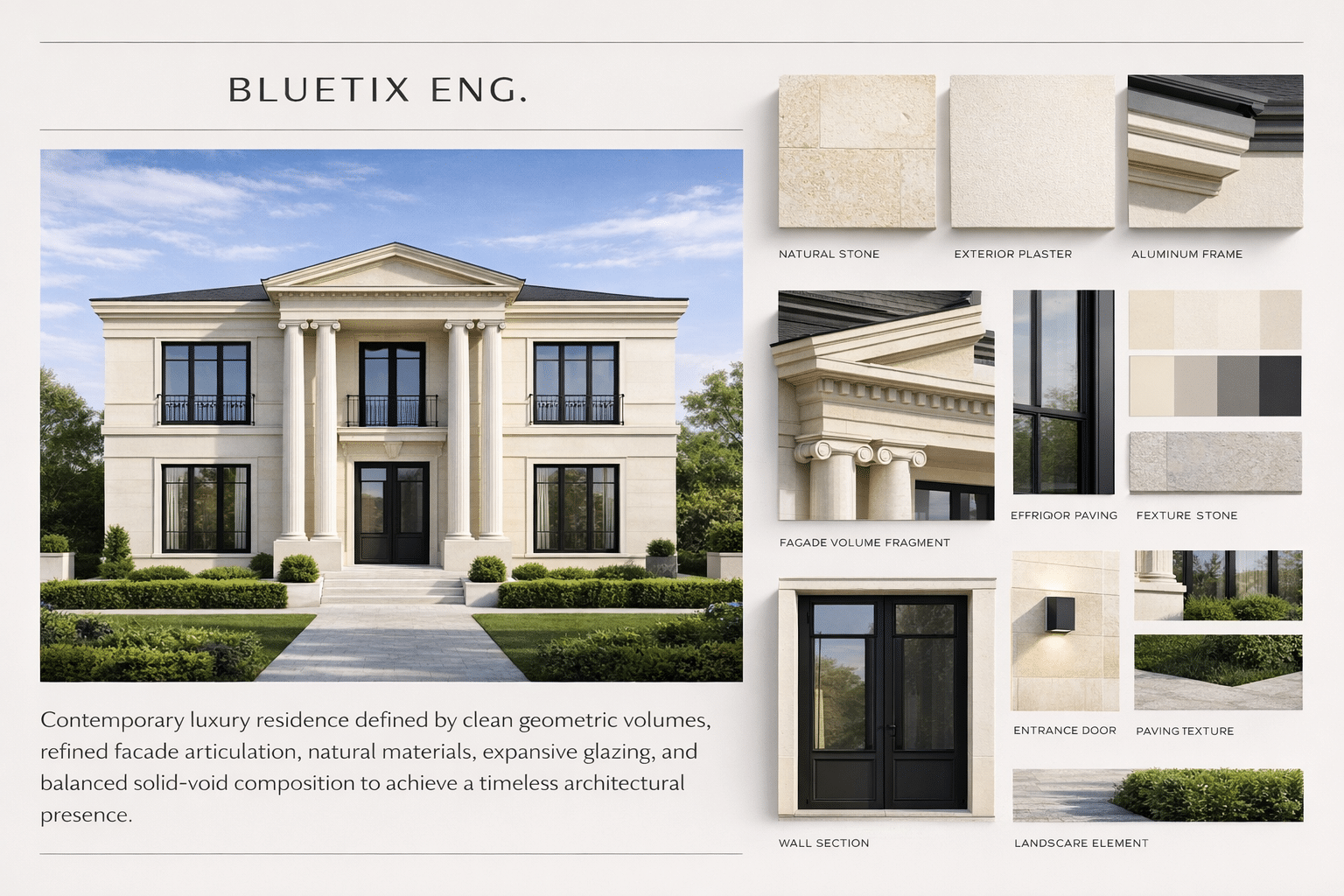 مشروع سكني فاخر مستوحى من العمارة النيو-كلاسيكية، حيث يعتمد التصميم على المحورية الواضحة والتماثل الهندسي في توزيع الكتل والفتحات المعمارية، مما يمنح المبنى حضوراً بصرياً قوياً وهوية معمارية راقية خالدة.