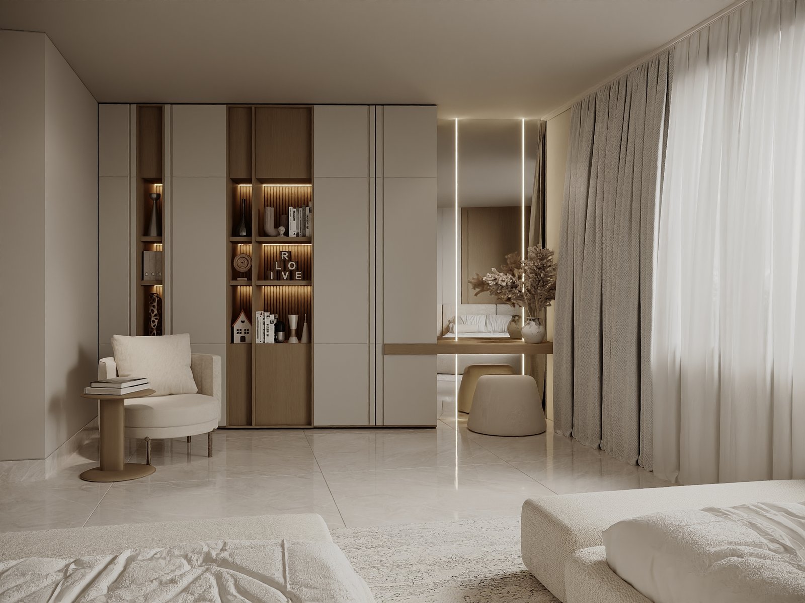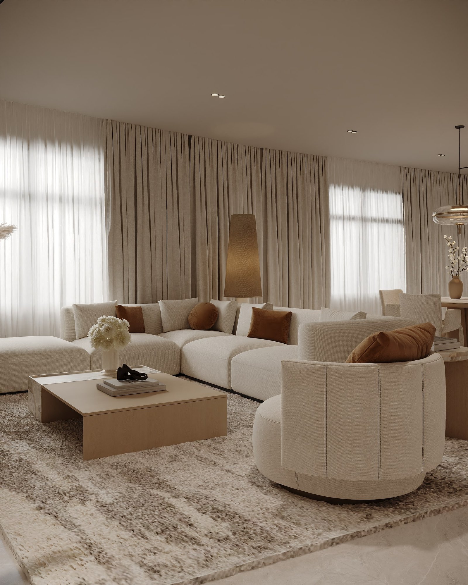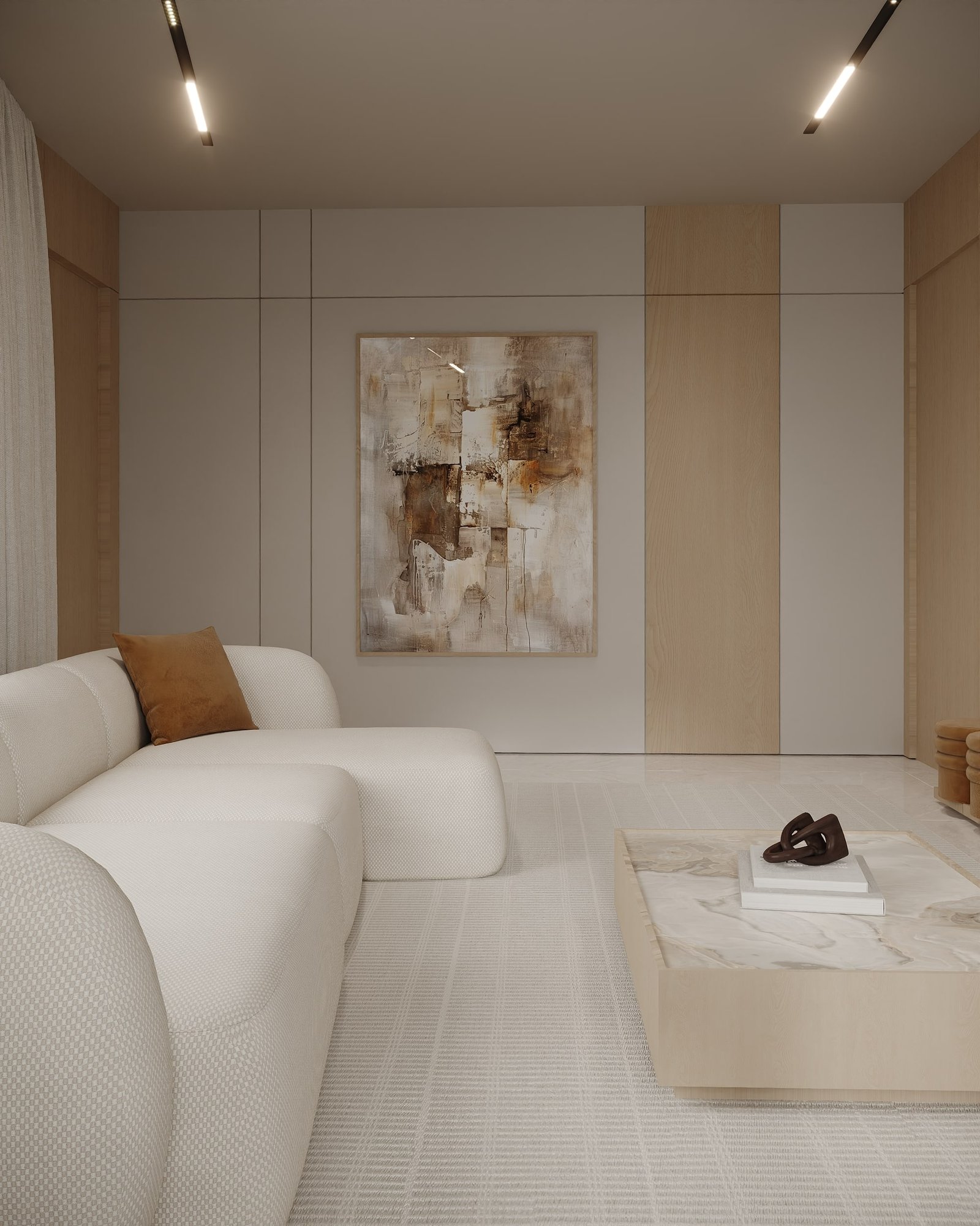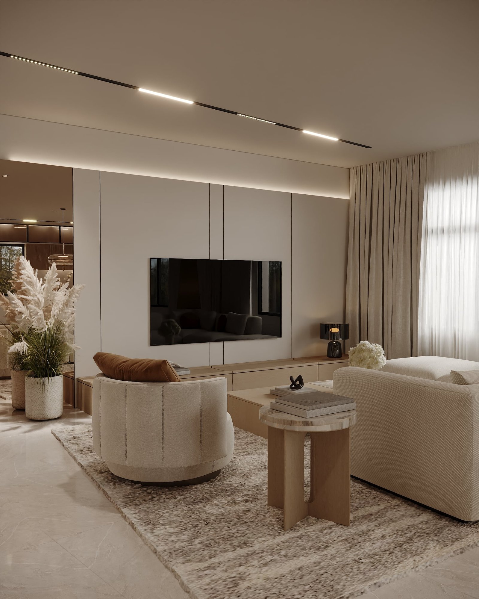 يرتكز المشروع على استخدام لوحة لونية هادئة مستوحاة من الطبيعة، تعتمد على درجات البيج والكريمي مع لمسات خشبية دافئة، بما يمنح الفراغ إحساساً بالراحة والاتساع والهدوء البصري. كما تم توظيف الخامات الطبيعية مثل الرخام، والأخشاب، والأقمشة عالية الجودة لتعزيز الشعور بالفخامة العملية التي تجمع بين الجمال والمتانة على المدى الطويل.