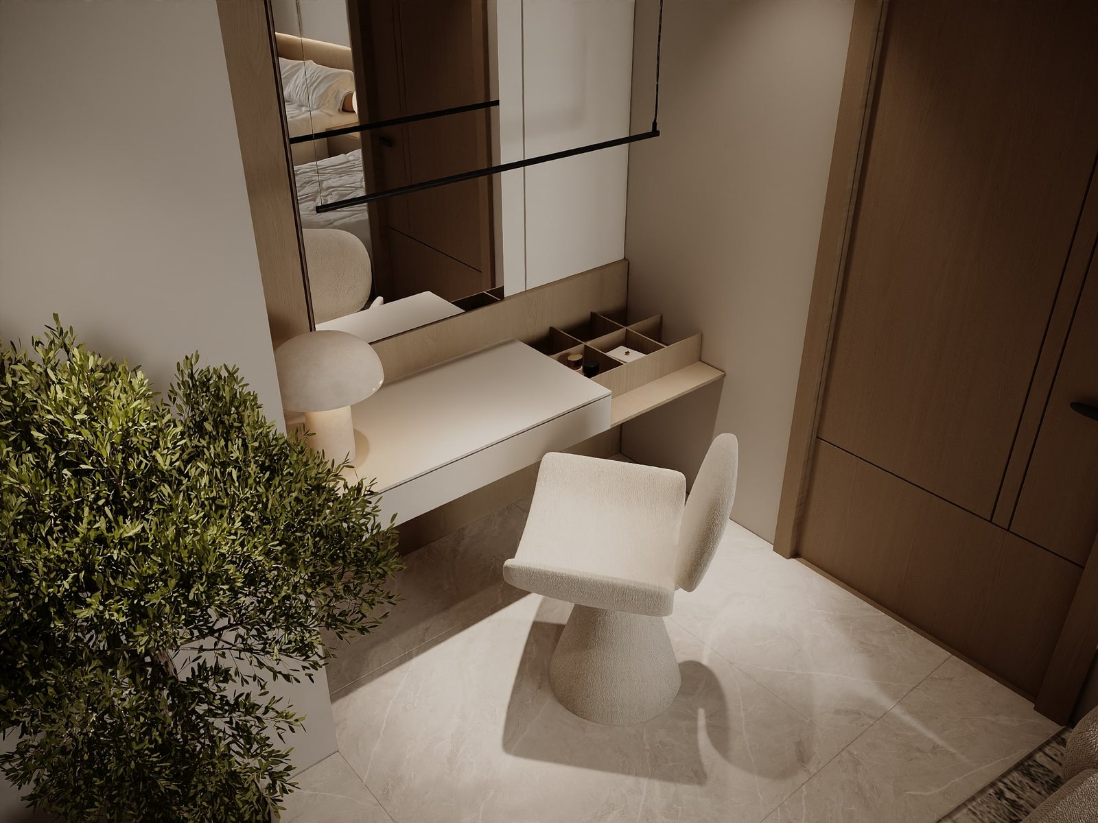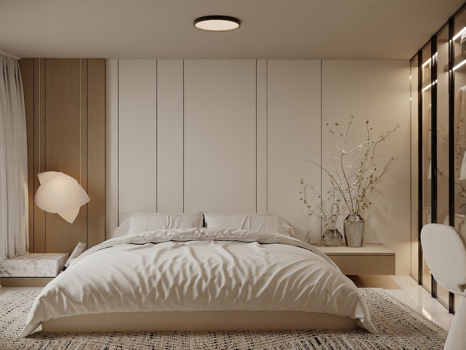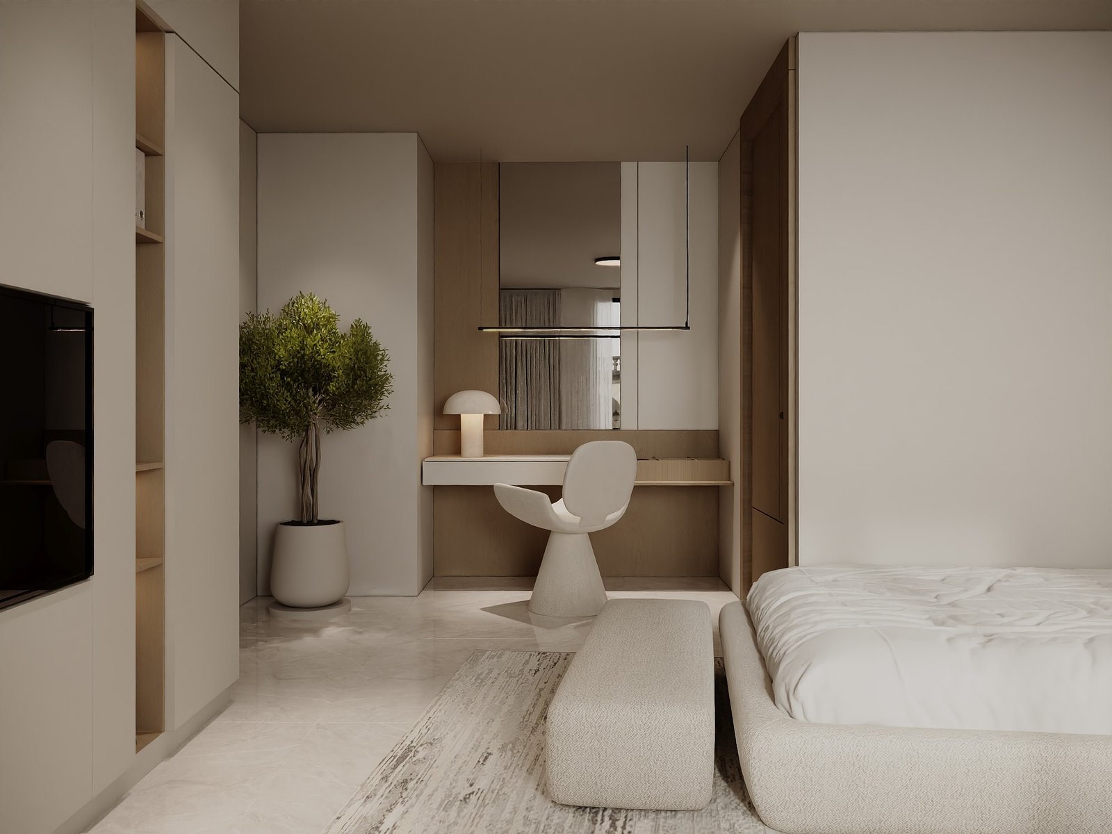 يرتكز المشروع على استخدام لوحة لونية هادئة مستوحاة من الطبيعة، تعتمد على درجات البيج والكريمي مع لمسات خشبية دافئة، بما يمنح الفراغ إحساساً بالراحة والاتساع والهدوء البصري. كما تم توظيف الخامات الطبيعية مثل الرخام، والأخشاب، والأقمشة عالية الجودة لتعزيز الشعور بالفخامة العملية التي تجمع بين الجمال والمتانة على المدى الطويل.