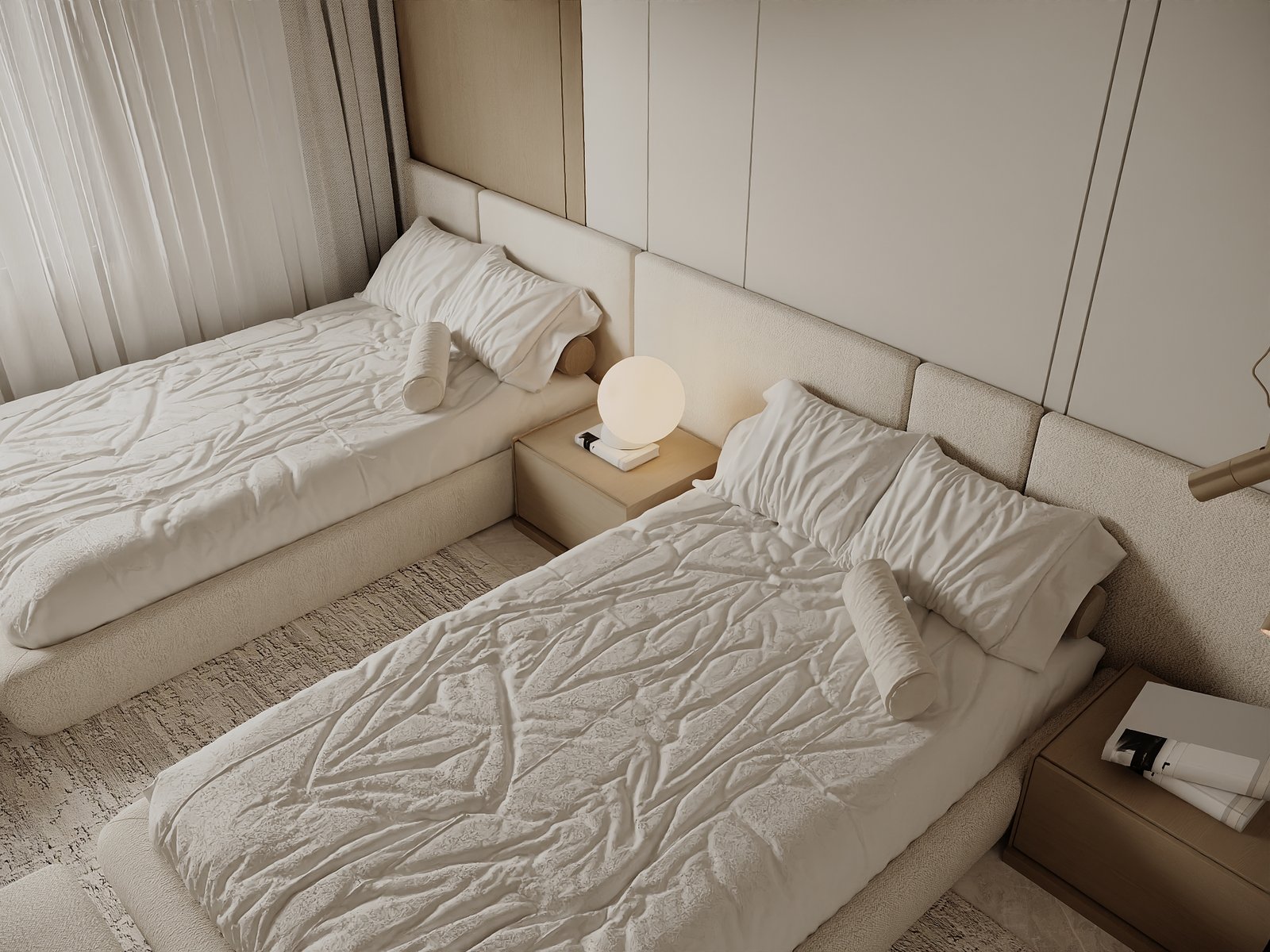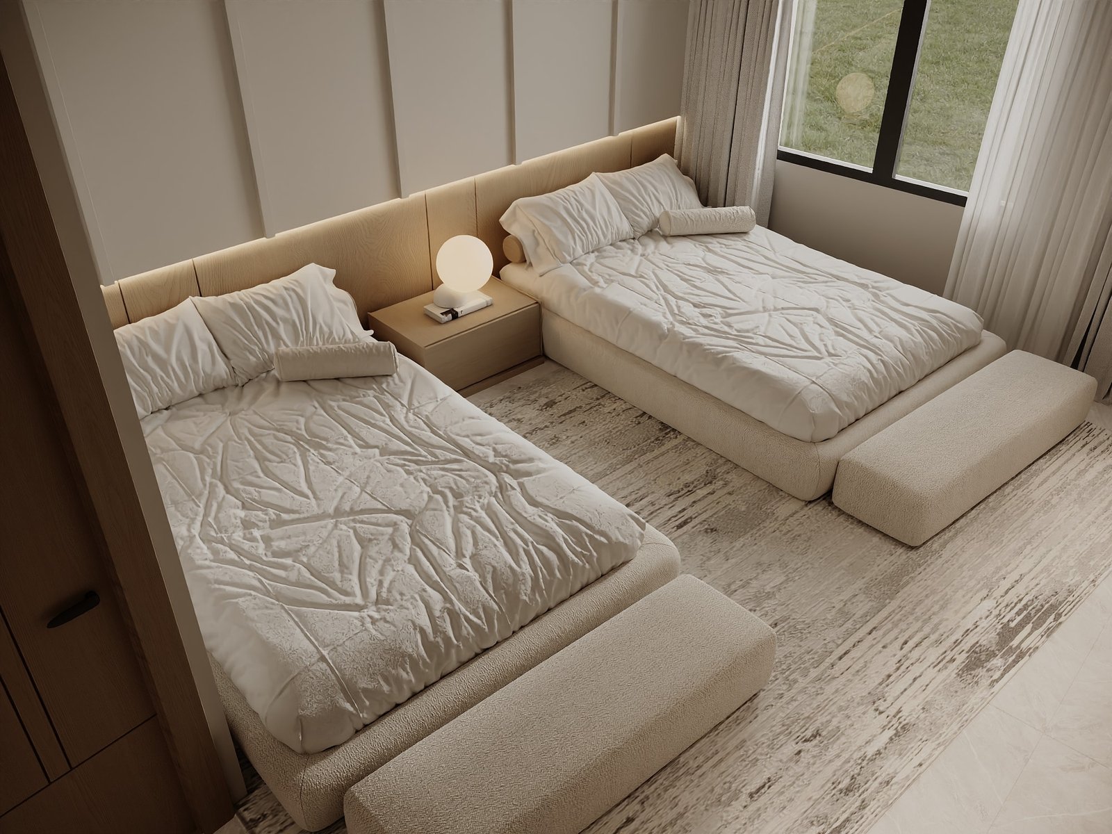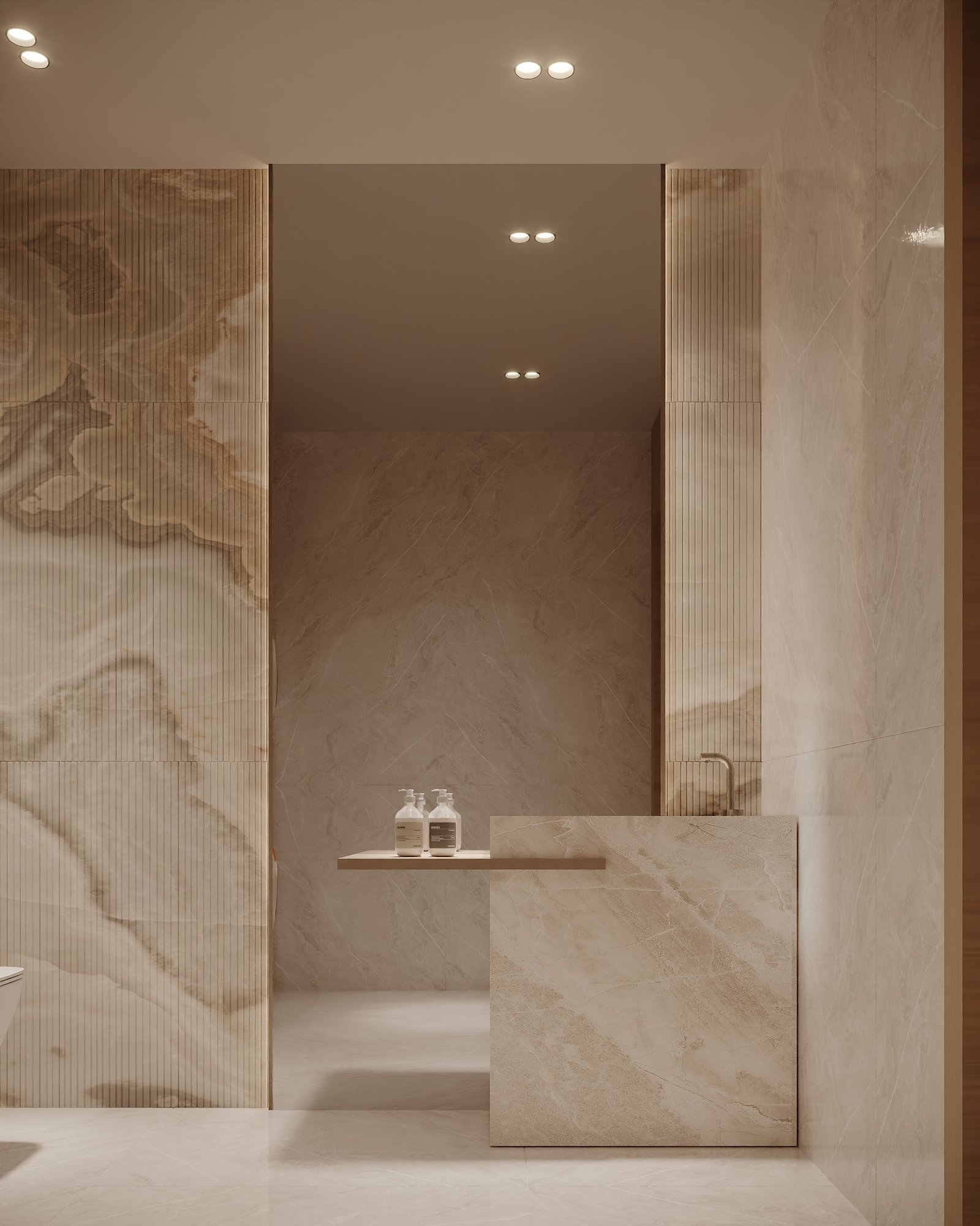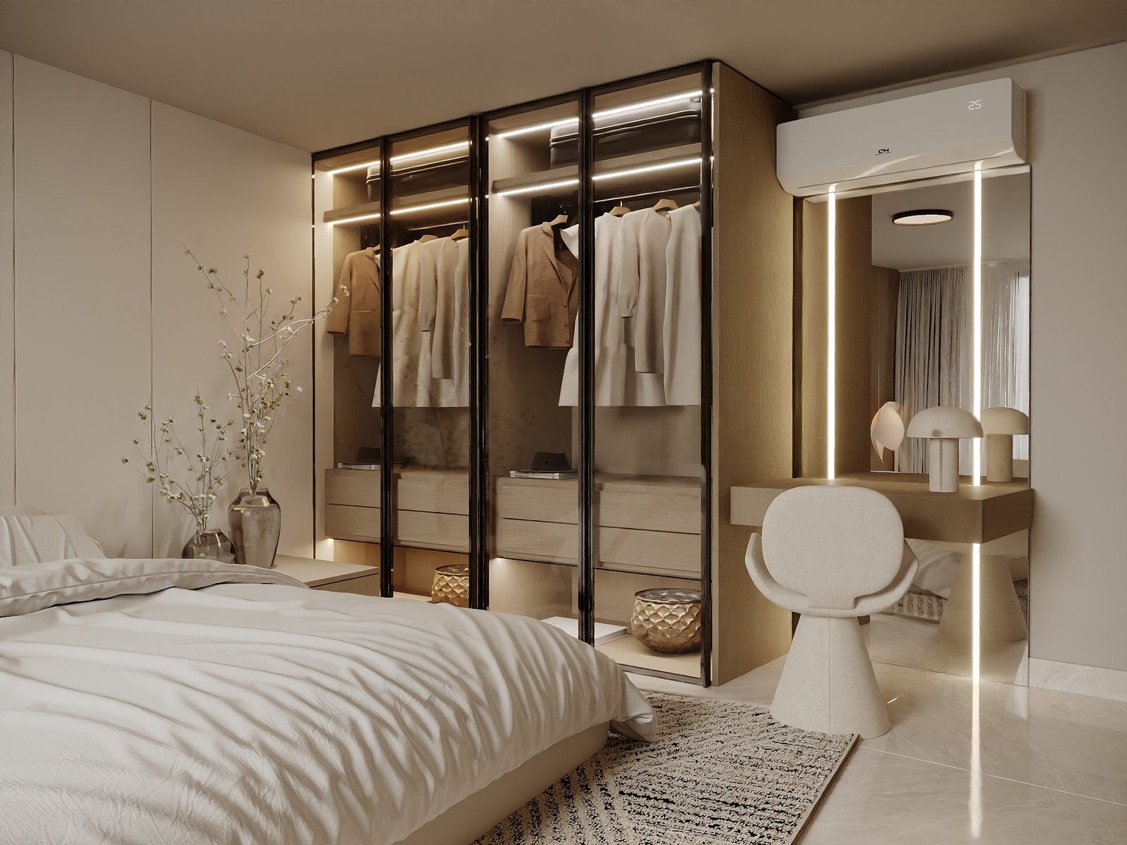 يرتكز المشروع على استخدام لوحة لونية هادئة مستوحاة من الطبيعة، تعتمد على درجات البيج والكريمي مع لمسات خشبية دافئة، بما يمنح الفراغ إحساساً بالراحة والاتساع والهدوء البصري. كما تم توظيف الخامات الطبيعية مثل الرخام، والأخشاب، والأقمشة عالية الجودة لتعزيز الشعور بالفخامة العملية التي تجمع بين الجمال والمتانة على المدى الطويل.