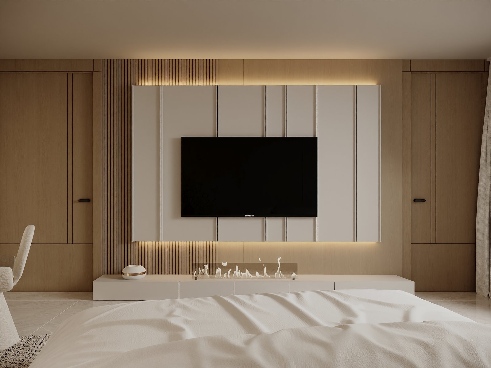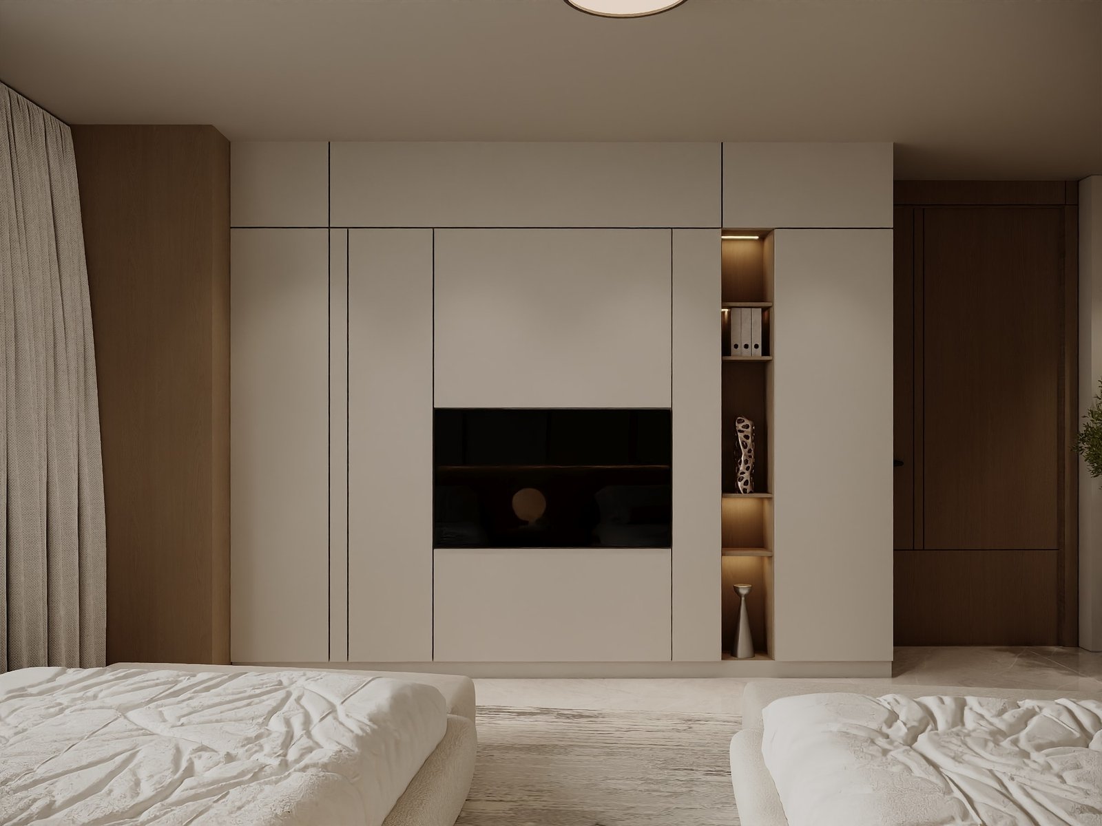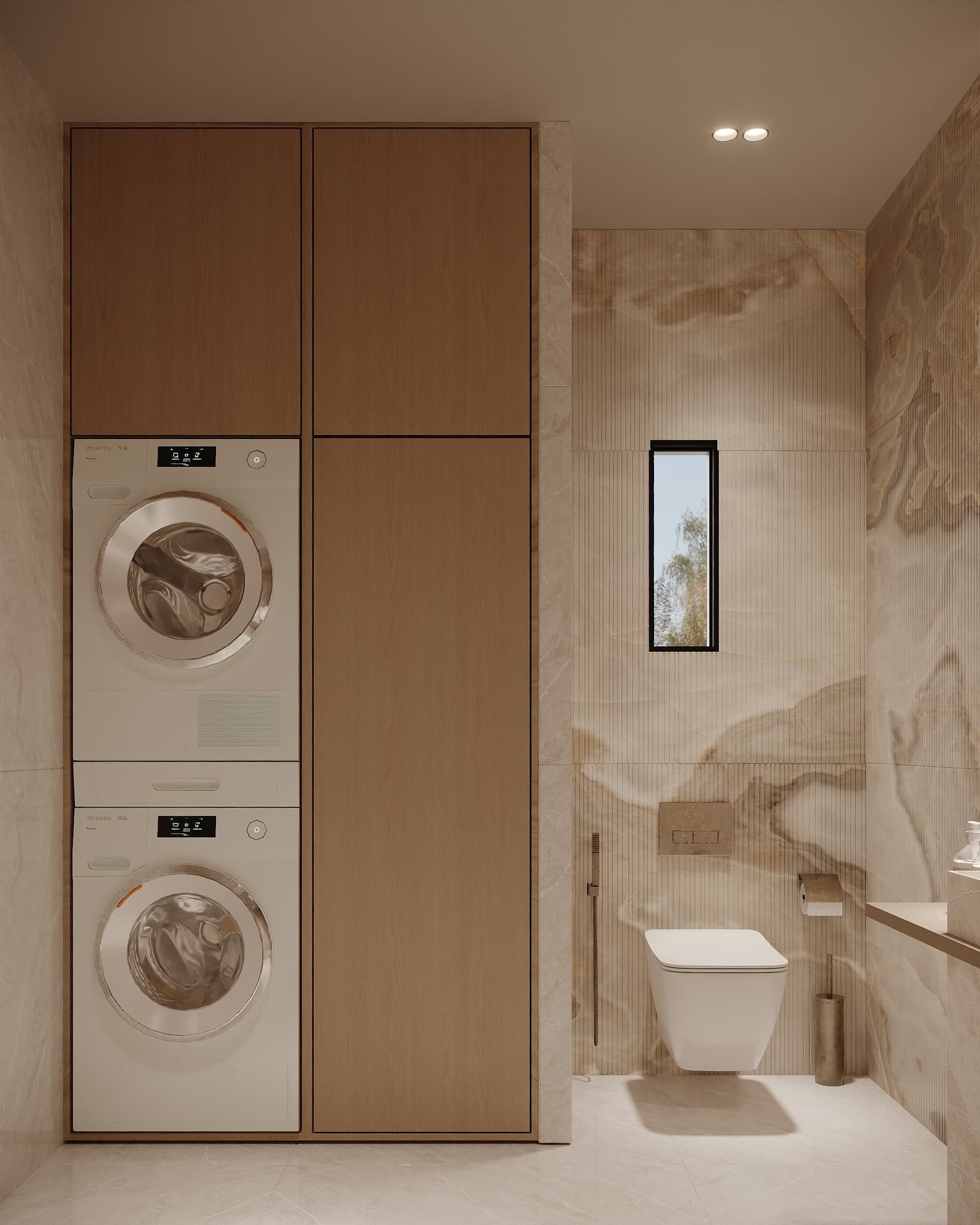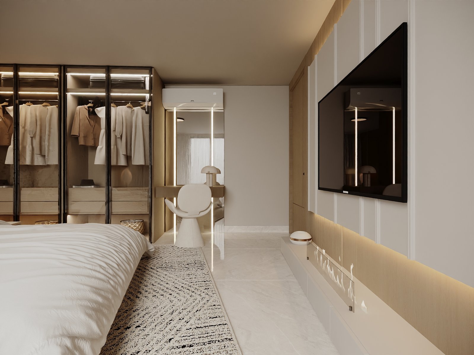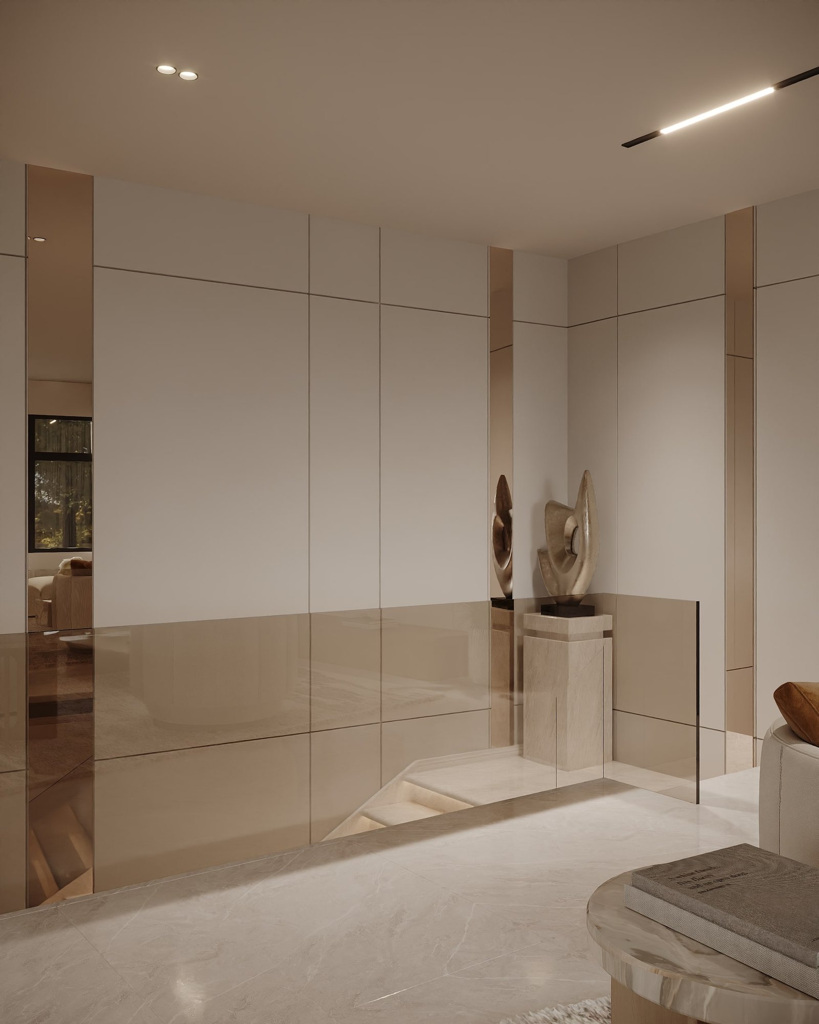 ويظهر الاهتمام بالتفاصيل المعمارية في تصميم الجدران والأسقف ووحدات التخزين، إضافة إلى استخدام أنظمة إضاءة متعددة المستويات تشمل الإضاءة المخفية والإضاءة المباشرة، مما يبرز العناصر الجمالية ويخلق أجواء مختلفة تتناسب مع الاستخدام اليومي أو الاستقبال. كما تم التركيز على تحقيق أقصى استفادة من المساحات من خلال حلول تخزين ذكية وتصميم أثاث مدمج يعزز من كفاءة الاستخدام دون التأثير على الطابع الجمالي العام.